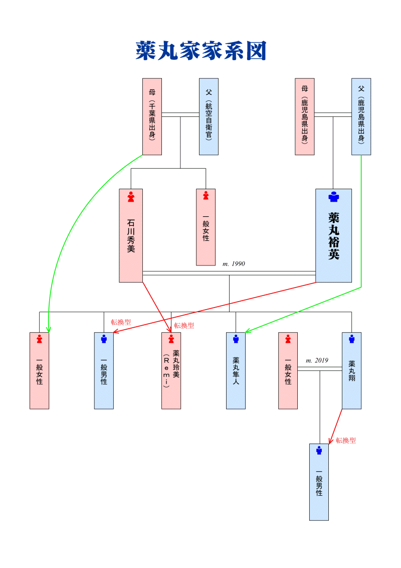 薬丸裕英関連薬丸家の縦横の法則と三親血縁の法則 未選択 2021年04月11日 元シブがき隊のメンバーで、テレビドラマや映画、バラエティ番組などで活躍している薬丸裕英さんに関連する薬丸家の縦横の法則と三親血縁の法則です。 画像を拡大 薬丸裕英・・・タレント、司会者、東京都武蔵野市生まれ、3男2女の父親 両親は鹿児島県出身 天干・・・己 地支・・・酉 → 石川秀美(配偶者) 最も影響を与えている先祖 → 母の母の父の曽祖父 人生の鍵を握る先祖 → 父の母の祖母 妻:石川秀美・・・元歌手、本名:薬丸秀美(旧姓:石川)、愛知県瀬戸市出身 千葉県木更津市の木更津基地に配属していた航空自衛官の父親と当地出身の母親との間の次女として生まれる 天干・・・癸 地支・・・酉 → 薬丸裕英(配偶者) 最も影響を与えている先祖 → 母の母の母の曽祖母 人生の鍵を握る先祖 → 父の父の祖父 長男:薬丸翔・・・俳優、旧芸名:SHO 長男がいる 天干・・・癸 地支・・・亥 → 一般女性(配偶者) 縦横の法則 → 薬丸裕英の父の父の曽祖父 最も影響を与えている先祖 → 石川秀美の母の母の曽祖母 人生の鍵を握る先祖 → 薬丸裕英の父の祖父 次男:薬丸隼人・・・CEサバデル・フベニールB(ユース)所属のサッカー選手 縦横の法則 → 薬丸裕英の父の祖父 長女:薬丸玲美(Remi)・・・タレント 縦横の法則 → 石川秀美(転換型) 翔さんのの三親血縁の法則の人生の鍵を握る先祖と隼人さんの縦横の法則が、ともに裕英さんの父の祖父となっています。 PR