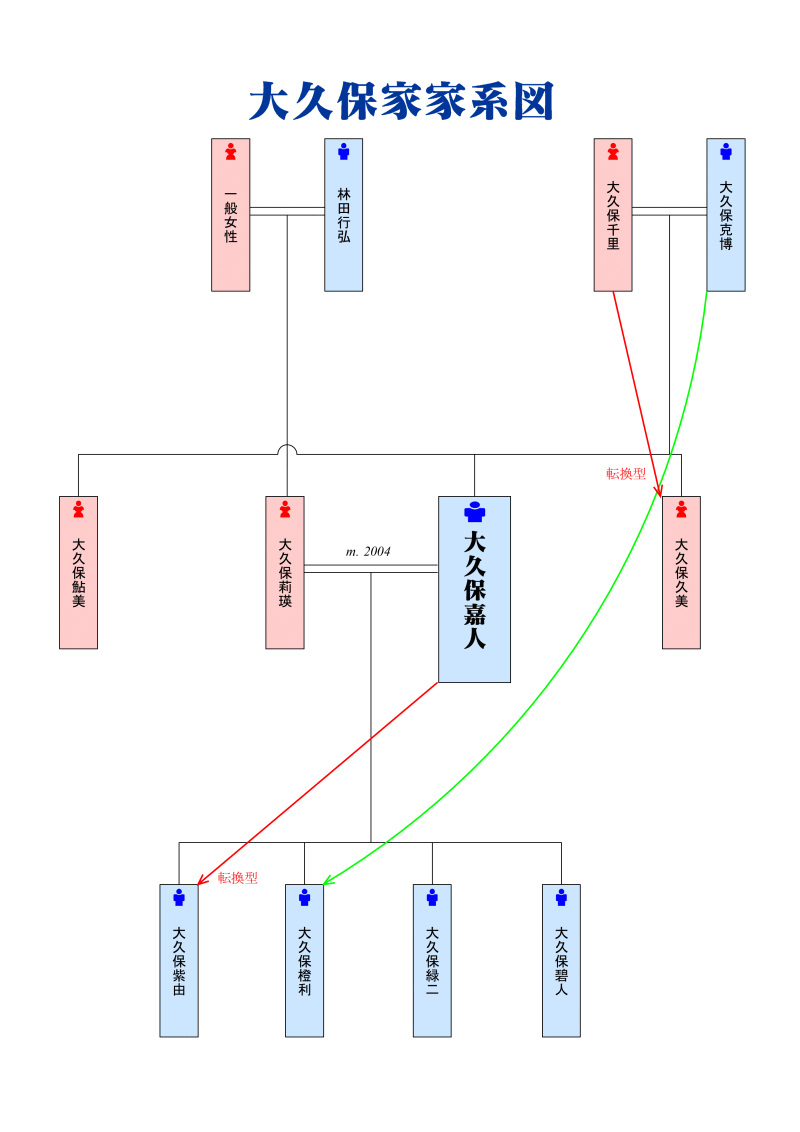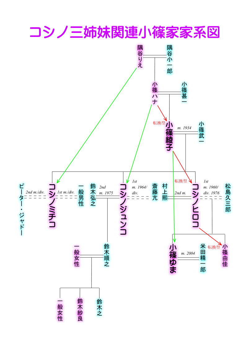 母の父の祖父:石橋正二郎・・・実業家、ブリヂストンタイヤ(現在のブリヂストン)創業者、プリンス自動車工業(現在の日産自動車)出資者、張り付け式ゴム底足袋(地下足袋)の考案者