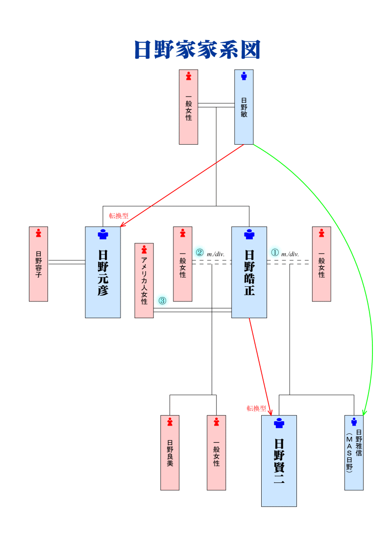 日野皓正関連日野家の縦横の法則と三親血縁の法則 未選択 2021年07月11日 世界的なジャズ・トランペット奏者として知られる日野皓正さんに関連する日野家の縦横の法則と三親血縁の法則です。 画像を拡大 父:日野敏・・・タップダンサー、トランペット奏者 日野皓正・・・ジャズ・トランペット(コルネット)奏者、アメリカ合衆国在住 20歳の時に知り合った恋人と最初の結婚、後に離婚 その後2人目の妻と再婚し、ニューヨークにいる時に離婚 3人目の妻となるアメリカ人女性と再々婚 天干・・・辛 地支・・・亥 → 一般女性2人(いずれも元妻)、アメリカ人女性(配偶者) 縦横の法則 → 日野敏の父の祖父 最も影響を与えている先祖 → 母の父の母の曽祖母 人生の鍵を握る先祖 → 日野敏の父の父の曽祖父 弟:日野元彦・・・ジャズドラマー 1999年、肝不全のため53歳で死去 妻は六本木「ALFIE」のオーナーである日野容子 天干・・・丁 地支・・・丑 → 日野容子(配偶者) 縦横の法則 → 日野敏(転換型) 最も影響を与えている先祖 → 母の父の父の曽祖父 人生の鍵を握る先祖 → 日野敏の母の母の曽祖母 長男:日野雅信(MAS日野)・・・楽器修理製作者 縦横の法則 → 日野敏 次男:日野賢二・・・ベーシスト、ソングライター、アレンジャー、音楽プロデューサー、アメリカ合衆国ニューヨーク在住、別名:JINO、日野"JINO"賢二 天干・・・癸 縦横の法則 → 日野皓正(転換型) 最も影響を与えている先祖 → 母の母の母の曽祖母 人生の鍵を握る先祖 → 日野敏 次女:日野良美・・・逮捕歴が2回ある(名前の読みはろみ) 1999年に旅券法違反の疑いで一度目の逮捕 2009年に尿検査を実施した後、陽性反応が出たため二度目の逮捕 長男の雅信さんの縦横の法則と次男の賢二さんの三親血縁の法則の人生の鍵を握る先祖がともに皓正さんの父親となる敏さんとなっています。 皓正さんが3回結婚しているので、子孫が今後どうなっていくのか注目すべきところです。