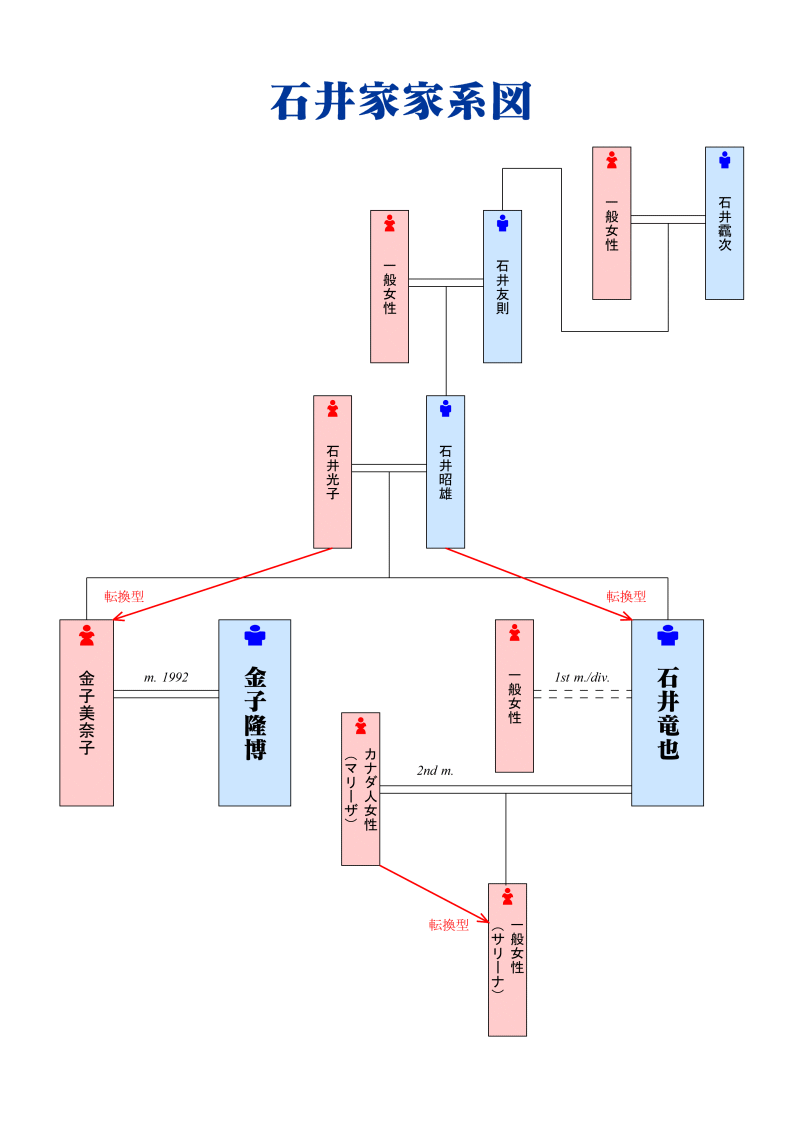 石井竜也関連石井家の縦横の法則と三親血縁の法則 未選択 2021年07月18日 米米CLUBのメンバーでカールスモーキー石井こと石井竜也さんに関連する石井家の縦横の法則と三親血縁の法則です。 画像を拡大 父:石井昭雄・・・和菓子屋経営、絵画が趣味、俳優を目指していた 母:石井光子・・・旧姓:鈴木、武士の家系がルーツ 父の父の祖父:石井友則・・・和菓子屋経営、画家になりたかった 父の父の父の曽祖父:石井靏次・・・和菓子屋経営、文学や芸術の道に進みたかった 石井竜也・・・ポップミュージシャン、歌手、芸術家、音楽プロデューサー、映画監督、舞台美術などのプロデューサー、デザイナー、絵画・オブジェ制作など、別名:カールスモーキー石井、石井ビューティー 前妻と離婚後、カナダ人のダンサーで女優のマリーザ(女優としての芸名:石井・ハナ・マリーザ)と再婚、長女のサリーナがいる 天干・・・丁 地支・・・未 → 一般女性(前妻)、カナダ人女性(マリーザ)(配偶者) 縦横の法則 → 石井昭雄(転換型) 最も影響を与えている先祖 → 石井光子の父の父の曽祖父 人生の鍵を握る先祖 → 石井昭雄の母の母の曽祖母 妹:金子美奈子・・・歌手、ダンサー、振付師、米米CLUBのダンシングチーム・SUE CREAM SUEのメンバー、エアロビクスインストラクターの資格、女優、ファッションブランド・MADAM MINAのプロデューサー、基礎化粧品ブランド・SURPRISMのプロデューサー、デザイナー、出生名:石井美奈子、別名:MINAKO、石井美奈子、大津みな子 天干・・・乙 地支・・・酉 → 金子隆博(配偶者) 縦横の法則 → 石井光子(転換型) 最も影響を与えている先祖 → 石井光子の父の祖父 人生の鍵を握る先祖 → 石井友則の母の曽祖母 妹の夫:金子隆博・・・サクソフォーン奏者、キーボーディスト、作曲家、編曲家、音楽プロデューサー、指揮者、米米CLUB及びホーンセクション・BIG HORNS BEEのメンバー、K2C SUESHINE BANDのメンバー、シューク・フラッシュ!のメンバー、別名:フラッシュ金子 天干・・・庚 地支・・・午 → 金子美奈子(配偶者) 最も影響を与えている先祖 → 父の父の母の曽祖母 人生の鍵を握る先祖 → 母の父の父の曽祖父 竜也さんは親や先祖のやりたかったことを実現させ、妹の美奈子さんも幅広い分野で活躍しており、それぞれ縦横の法則でいう父や母の転換型であることを感じさせます。
