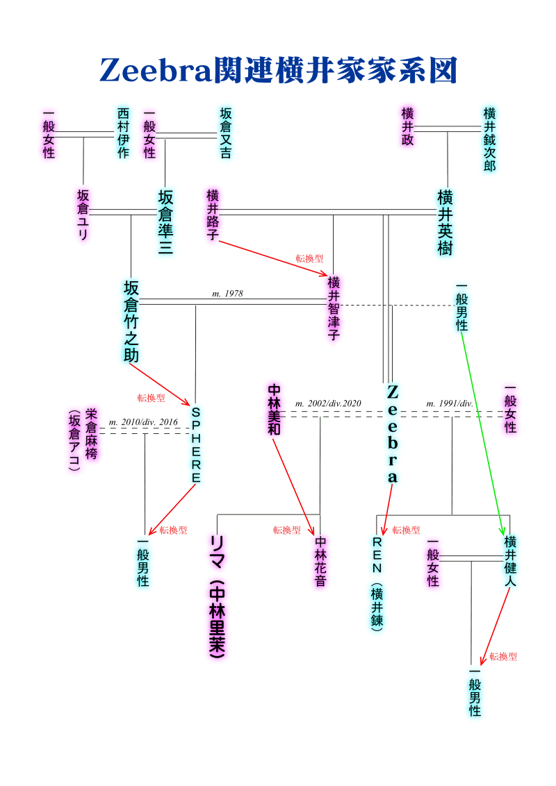 妻の兄:四代目坂田藤十郎・・・歌舞伎役者、日本芸術院会員、重要無形文化財保持者(人間国宝)、本名:林宏太郎、旧芸名:二代目中村扇雀、三代目中村鴈治郎、舞踊での名称:雁音歌扇