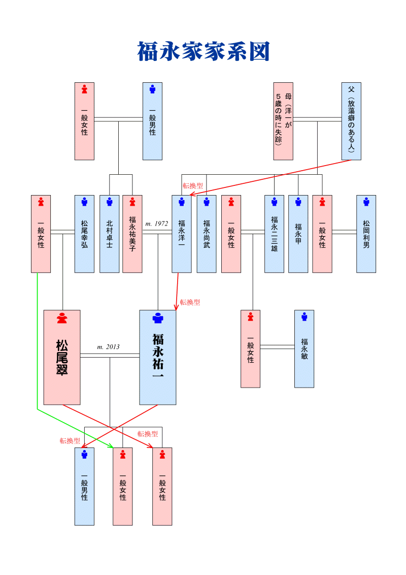 福永祐一関連福永家の縦横の法則と三親血縁の法則(改訂版) 未選択 2023年03月05日 日本中央競馬会 (JRA) の元騎手で2023年3月から調教師となった福永祐一さんに関連する福永家の縦横の法則と三親血縁の法則です。 画像を拡大 父:福永洋一・・・元騎手 父親は放蕩癖のある人物 母親は5歳時に失踪 1979年の毎日杯でマリージョーイに騎乗した時に落馬事故し、1981年に騎手を引退 天干・・・丁 地支・・・丑 → 福永祐美子(配偶者) 縦横の法則 → 父の転換型 最も影響を与えている先祖 → 母の父の父の曽祖父 人生の鍵を握る先祖 → 父の母の母の曽祖母 福永祐一・・・日本中央競馬会 (JRA) 所属の元騎手、調教師 長女、次女、長男がいる 天干・・・乙 地支・・・未 → 松尾翠(配偶者) 縦横の法則 → 福永洋一(転換型) 最も影響を与えている先祖 → 福永祐美子の父の祖父 人生の鍵を握る先祖 → 福永洋一の父の母の曽祖母 妻:松尾翠・・・元フジテレビアナウンサー、フリーアナウンサー、本名:福永翠 (旧姓:松尾) 父親は陸上自衛隊陸将の松尾幸弘 天干・・・辛 地支・・・未 → 福永祐一(配偶者) 最も影響を与えている先祖 → 母の父の母の曽祖母 人生の鍵を握る先祖 → 松尾幸弘の父の父の曽祖父 洋一の姉の夫:松岡利男・・・高知競馬所属の騎手 福永家に競馬界との縁が築かれた 伯父:福永甲・・・日本中央競馬会 (JRA)に所属していた騎手、調教師 天干・・・己 最も影響を与えている先祖 → 母の母の父の曽祖父 人生の鍵を握る先祖 → 父の母の祖母 伯父:福永二三雄・・・大井競馬に所属していた元騎手、元調教師 娘婿に大井競馬所属の調教師である福永敏がいる 天干・・・辛 地支・・・丑 → 一般女性(配偶者) 最も影響を与えている先祖 → 母の父の母の曽祖母 人生の鍵を握る先祖 → 父の父の父の曽祖父 伯父:福永尚武・・・船橋競馬に所属していた騎手 叔父:北村卓士・・・日本中央競馬会 (JRA) 所属の元騎手 1998年新潟競馬場での障害競走で落馬事故し、2000年に騎手を引退 天干・・・丁 最も影響を与えている先祖 → 母の父の父の曽祖父 人生の鍵を握る先祖 → 父の母の母の曽祖母 父の洋一さんと叔父の北村卓士さんの天干がともに丁で、落馬事故した後、騎手を引退しているのも共通しています。 PR