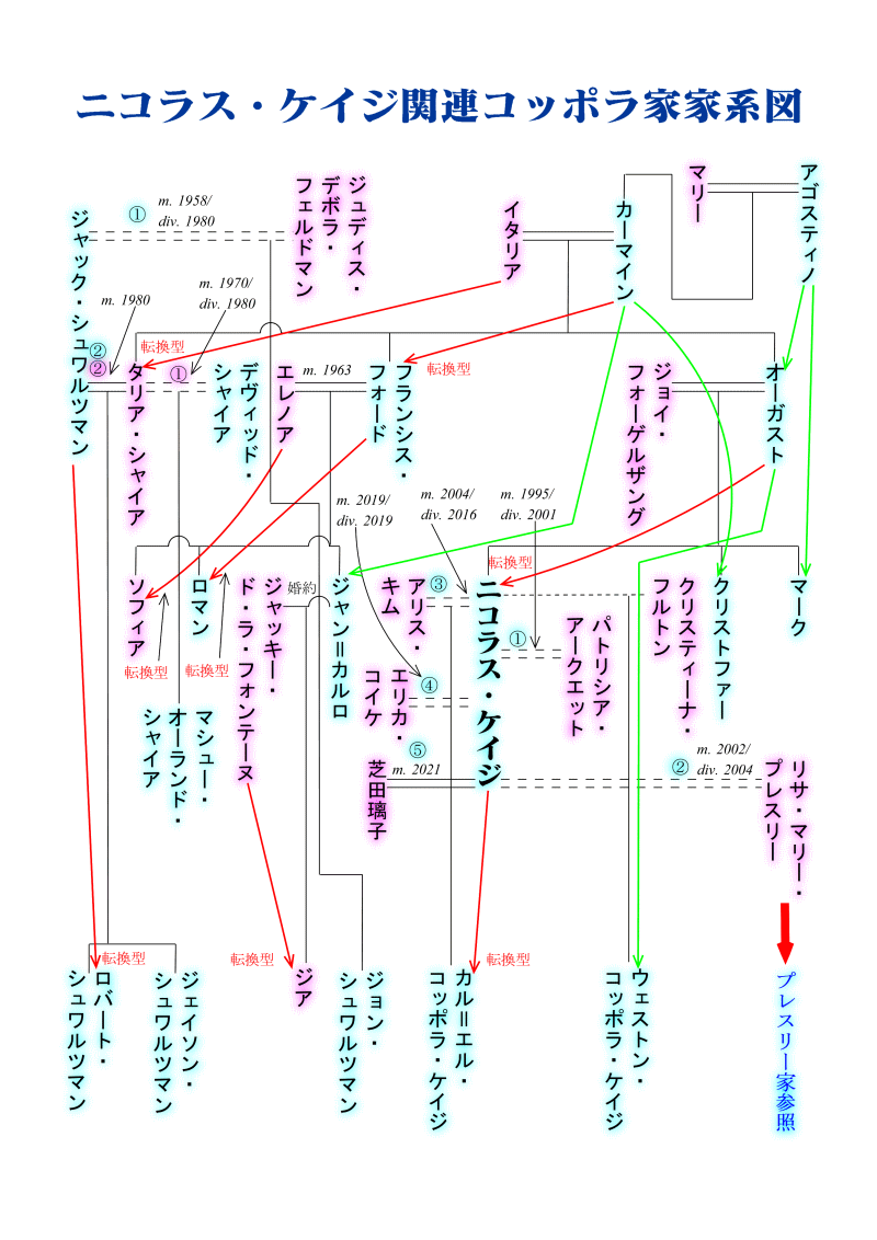 1995年の『リービング・ラスベガス』で、アカデミー賞などの主演男優賞を受賞した俳優、映画監督のニコラス・ケイジに関連するコッポラ家の縦横の法則と三親血縁の法則です。