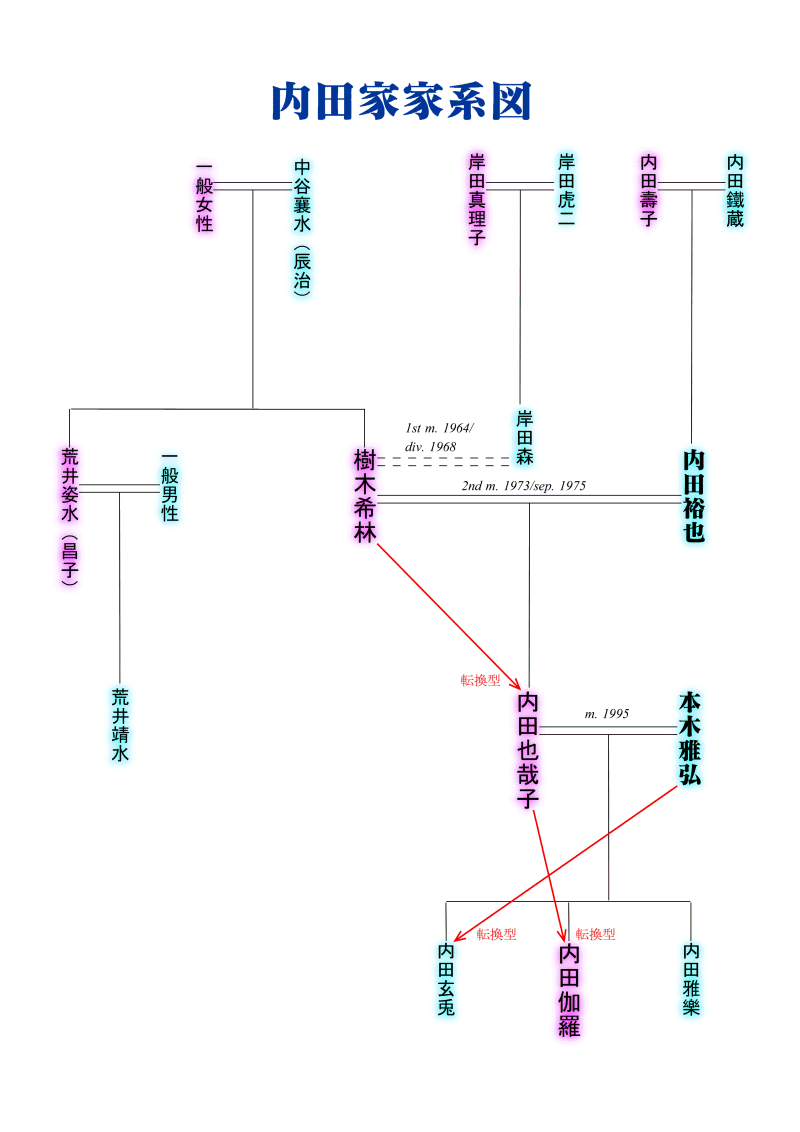 ミュージシャンや俳優として活躍された内田裕也さん、妻の樹木希林さん、娘婿で元シブがき隊メンバーの本木雅弘さんに関連する内田家の縦横の法則と三親血縁の法則です。