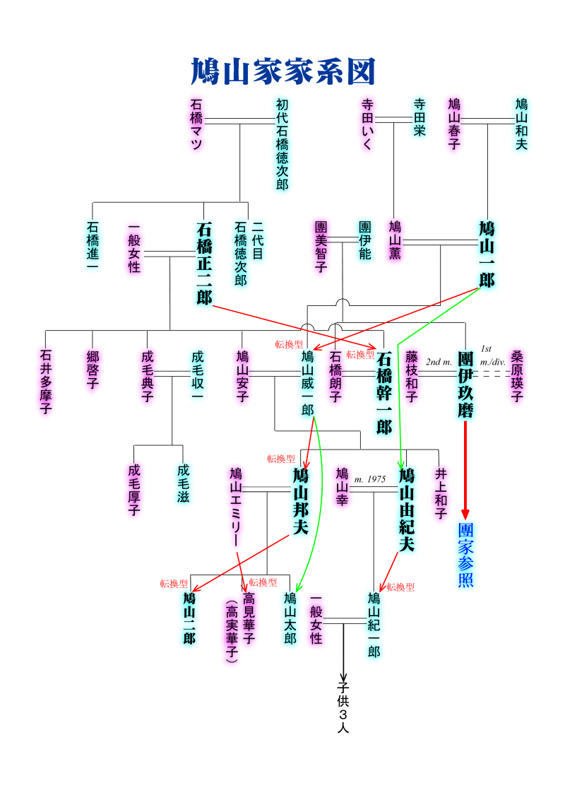 父:鳩山威一郎・・・政治家、大蔵官僚、正三位勲一等、第52・53・54代内閣総理大臣である鳩山一郎・薫夫妻の長男