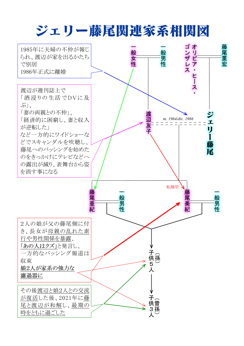 長女の美紀さんについてですが、縦横の法則渡辺友子さんの転換型三親血縁の法則の人生の鍵を握る先祖がジェリーさんの母親となるイギリス人のオリビアとなっており、友子さんの乱れた素行や男性関係を暴露し、物議を醸したことで一方的なバッシング報道を収束させ、長女としての役目を果たしました。