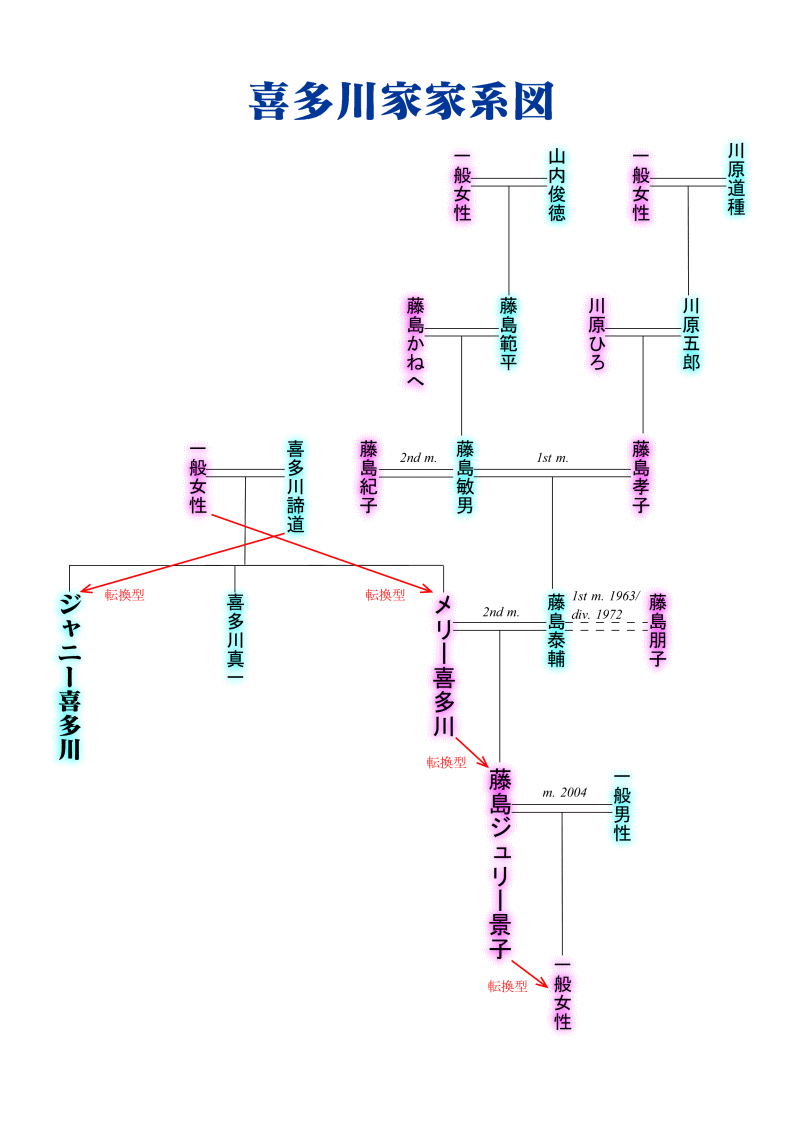 姉:メリー喜多川(Mary Y. Kitagawa)・・・実業家、芸能プロモーター、ジャニーズ事務所名誉会長、ジャニーズ・エンタテイメント代表取締役社長、アメリカ合衆国ロサンゼルス生まれ、本名:藤島メリー泰子