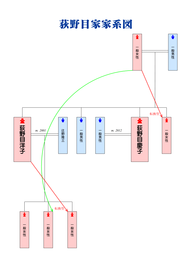 映画 『南極物語』などでの出演で知られる荻野目慶子さんと「ダンシング・ヒーロー」などの楽曲のヒットで知られ、バラエティー番組などにも出演していた荻野目洋子さん姉妹に関連する荻野目家の縦横の法則と三親血縁の法則です。